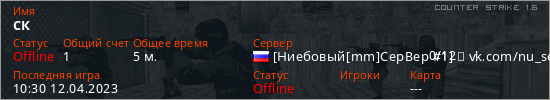 Играет на Counter Strike 1.6 сервере. Страна: РоссияПервый раз замечен 10:19 12.04.2023