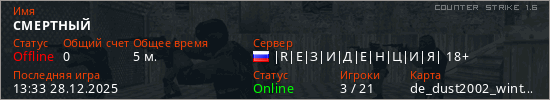 Играет на Counter Strike 1.6 сервере. Страна: РоссияПервый раз замечен 13:26 28.12.2025