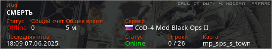 Играет на Call of Duty 4: Modern Warfare сервере. Страна: РоссияПервый раз замечен 18:07 07.06.2025