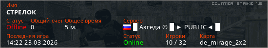 Играет на Counter Strike 1.6 сервере. Страна: РоссияПервый раз замечен 14:15 23.03.2026