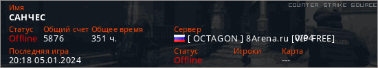 Играет на Counter Strike Source сервере. Страна: РоссияПервый раз замечен 12:50 22.11.2021