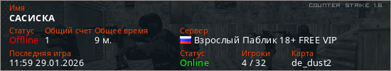 Играет на Counter Strike 1.6 сервере. Страна: РоссияПервый раз замечен 19:31 26.01.2026