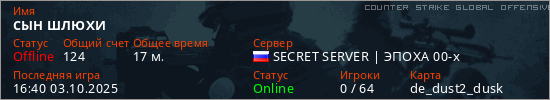 Играет на Counter Strike Global Offensive сервере. Страна: РоссияПервый раз замечен 14:43 03.10.2025