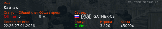 Играет на Counter Strike 1.6 сервере. Страна: РоссияПервый раз замечен 15:33 24.01.2026