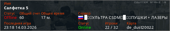 Играет на Counter Strike 1.6 сервере. Страна: РоссияПервый раз замечен 23:58 01.03.2026