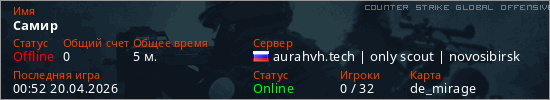 Играет на Counter Strike Global Offensive сервере. Страна: РоссияПервый раз замечен 00:45 20.04.2026