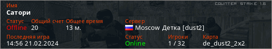 Играет на Counter Strike 1.6 сервере. Страна: РоссияПервый раз замечен 10:51 18.02.2024