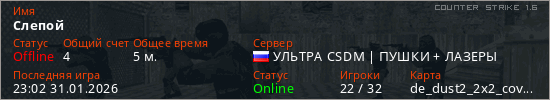 Играет на Counter Strike 1.6 сервере. Страна: РоссияПервый раз замечен 22:56 31.01.2026