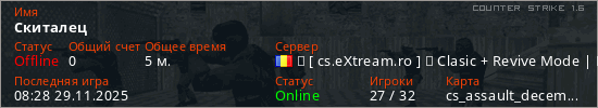 Играет на Counter Strike 1.6 сервере. Страна: РумынияПервый раз замечен 08:26 29.11.2025