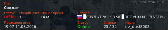 Играет на Counter Strike 1.6 сервере. Страна: РоссияПервый раз замечен 08:21 08.03.2026