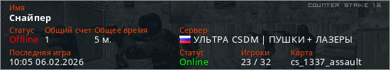 Играет на Counter Strike 1.6 сервере. Страна: РоссияПервый раз замечен 09:59 06.02.2026