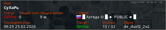 Играет на Counter Strike 1.6 сервере. Страна: РоссияПервый раз замечен 09:00 25.02.2026