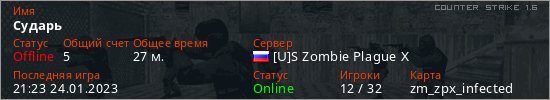 Играет на Counter Strike 1.6 сервере. Страна: РоссияПервый раз замечен 20:58 24.01.2023