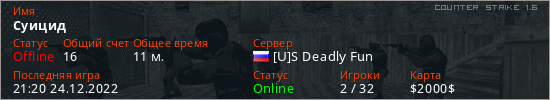 Играет на Counter Strike 1.6 сервере. Страна: РоссияПервый раз замечен 21:11 24.12.2022