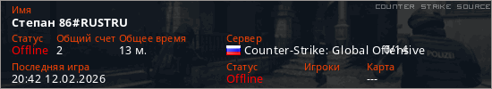 Играет на Counter Strike Source сервере. Страна: РоссияПервый раз замечен 16:26 04.02.2026