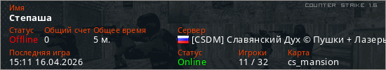 Играет на Counter Strike 1.6 сервере. Страна: РоссияПервый раз замечен 15:06 16.04.2026