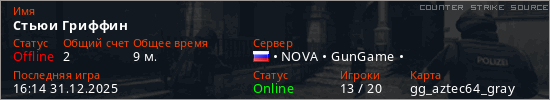 Играет на Counter Strike Source сервере. Страна: РоссияПервый раз замечен 20:54 29.12.2025