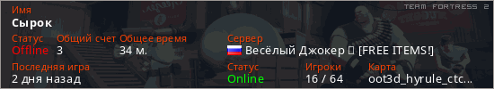 Играет на Team Fortress 2 сервере. Страна: РоссияПервый раз замечен 19:15 14.03.2026
