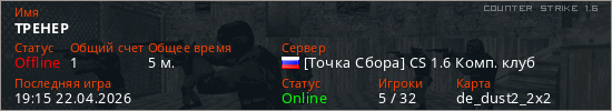 Играет на Counter Strike 1.6 сервере. Страна: РоссияПервый раз замечен 19:13 22.04.2026