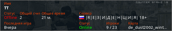 Играет на Counter Strike 1.6 сервере. Страна: РоссияПервый раз замечен 12:15 10.02.2025