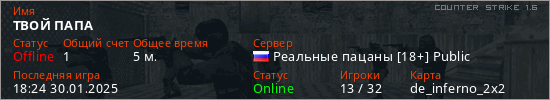 Играет на Counter Strike 1.6 сервере. Страна: РоссияПервый раз замечен 18:18 30.01.2025