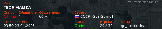 Играет на Counter Strike 1.6 сервере. Страна: РоссияПервый раз замечен 15:08 02.01.2025