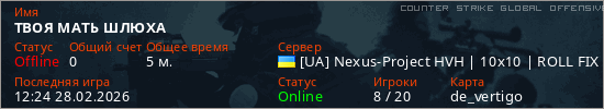Играет на Counter Strike Global Offensive сервере. Страна: УкраинаПервый раз замечен 12:20 28.02.2026