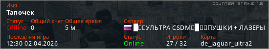 Играет на Counter Strike 1.6 сервере. Страна: РоссияПервый раз замечен 12:28 02.04.2026