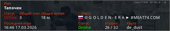 Играет на Counter Strike 1.6 сервере. Страна: РоссияПервый раз замечен 10:22 17.03.2026