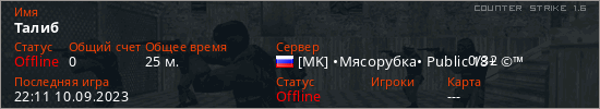 Играет на Counter Strike 1.6 сервере. Страна: РоссияПервый раз замечен 22:27 19.08.2023