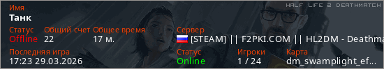 Играет на Half Life 2 DeathMatch сервере. Страна: РоссияПервый раз замечен 16:49 14.03.2026
