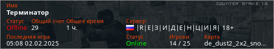 Играет на Counter Strike 1.6 сервере. Страна: РоссияПервый раз замечен 13:48 26.01.2025