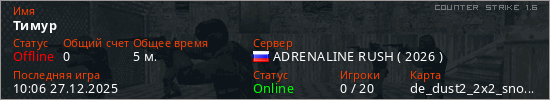Играет на Counter Strike 1.6 сервере. Страна: РоссияПервый раз замечен 10:04 27.12.2025
