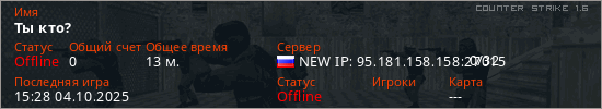 Последний раз был в сети 15:28 04.10.2025 Игрок с таким ником замечен на 8 серверах