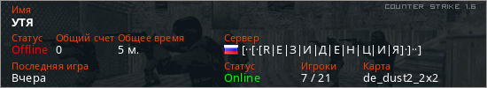 Играет на Counter Strike 1.6 сервере. Страна: РоссияПервый раз замечен 18:39 27.03.2026
