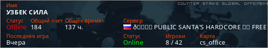 Играет на Counter Strike Global Offensive сервере. Страна: РоссияПервый раз замечен 11:05 18.01.2025