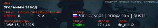 Играет на Counter Strike Global Offensive сервере. Страна: РоссияПервый раз замечен 10:23 15.11.2025