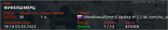 Играет на Counter Strike 1.6 сервере. Страна: РоссияПервый раз замечен 19:41 23.02.2025