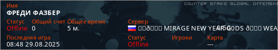 Играет на Counter Strike Global Offensive сервере. Страна: РоссияПервый раз замечен 08:42 29.08.2025