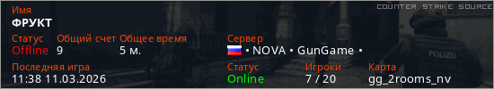 Играет на Counter Strike Source сервере. Страна: РоссияПервый раз замечен 11:36 11.03.2026