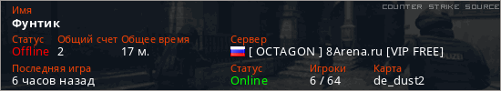 Играет на Counter Strike Source сервере. Страна: РоссияПервый раз замечен 17:56 02.03.2026