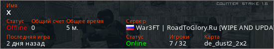 Играет на Counter Strike 1.6 сервере. Страна: РоссияПервый раз замечен 21:29 11.01.2026