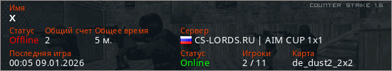 Играет на Counter Strike 1.6 сервере. Страна: РоссияПервый раз замечен 00:03 09.01.2026