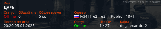 Играет на Counter Strike Source сервере. Страна: РоссияПервый раз замечен 20:12 05.01.2025