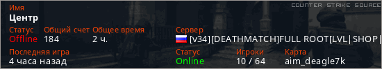 Играет на Counter Strike Source сервере. Страна: РоссияПервый раз замечен 11:06 17.08.2025