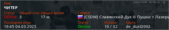 Играет на Counter Strike 1.6 сервере. Страна: РоссияПервый раз замечен 21:17 16.01.2025