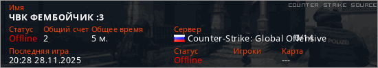 Играет на Counter Strike Source сервере. Страна: РоссияПервый раз замечен 20:13 28.11.2025