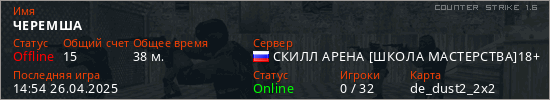 Играет на Counter Strike 1.6 сервере. Страна: РоссияПервый раз замечен 21:52 22.04.2025