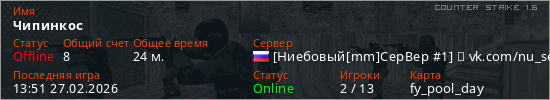 Играет на Counter Strike 1.6 сервере. Страна: РоссияПервый раз замечен 16:06 23.02.2026