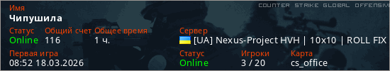 Играет на Counter Strike Global Offensive сервере. Страна: УкраинаПервый раз замечен 08:52 18.03.2026